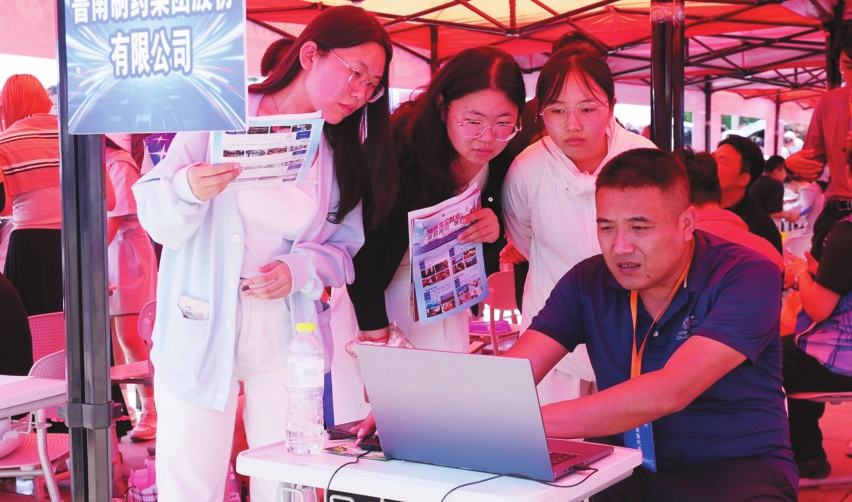 6月11日,山东外国语职业技术大学的学生在就业双选会现场与企业代表沟通交流。