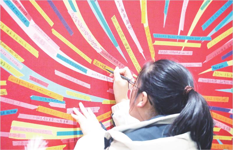 2025年12月31日,在日照银座茂,市民正在心愿墙上写下新年愿望。