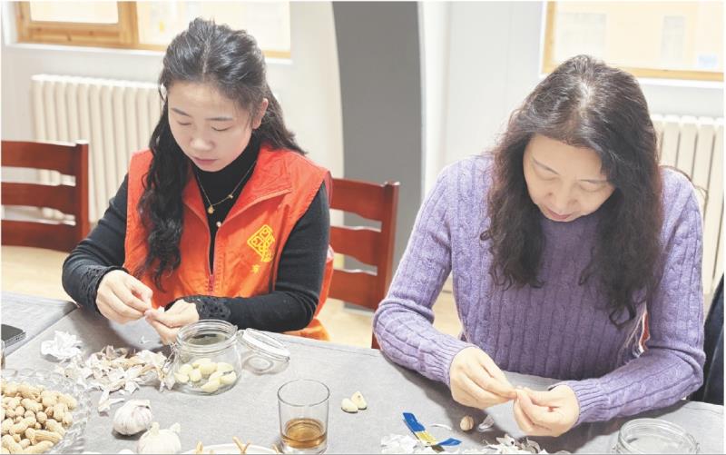 1月26日,东港区石臼街道翔海社区内暖意融融,工作人员与居民游客一起制作腊八蒜,沉浸式体验传统民俗。