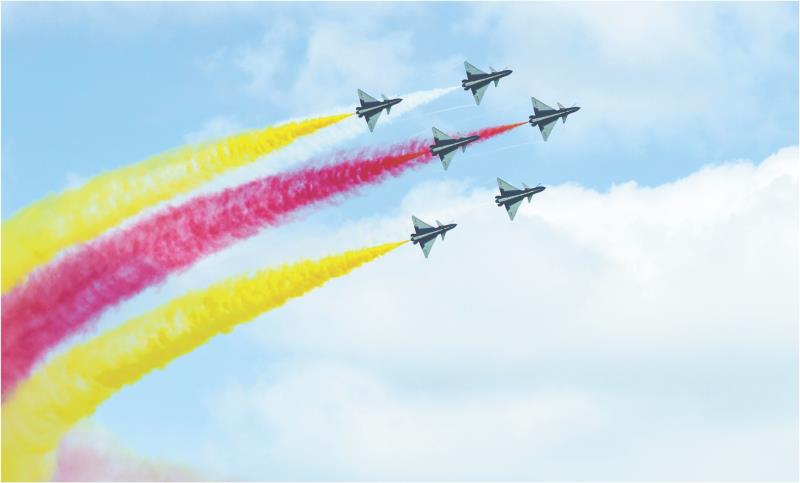1月30日上午,中国空军八一飞行表演队在新加坡樟宜机场海面上空展开空中特技动作飞行。