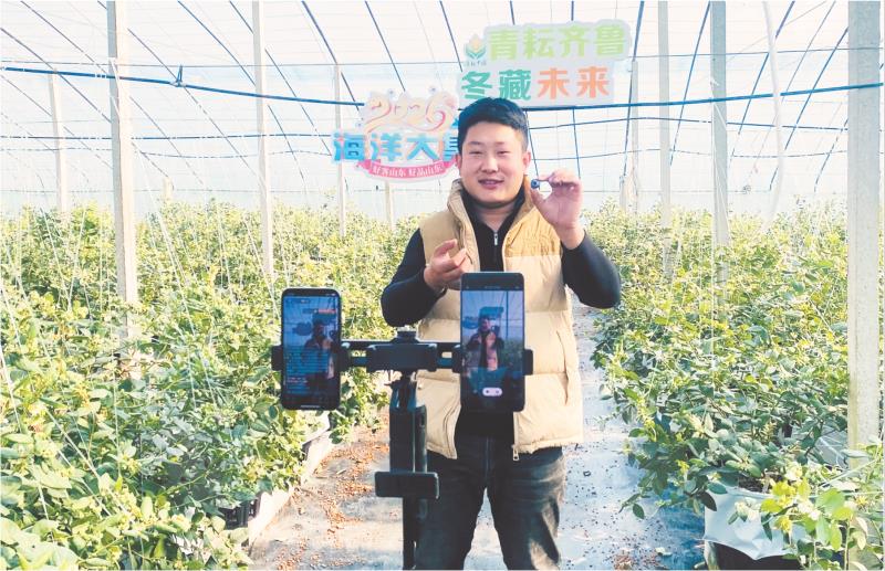 近日,在莒县安庄镇中安庄村的蓝莓种植大棚内,村党支部书记张连鑫手持刚采摘的蓝莓,通过直播向网友推介。