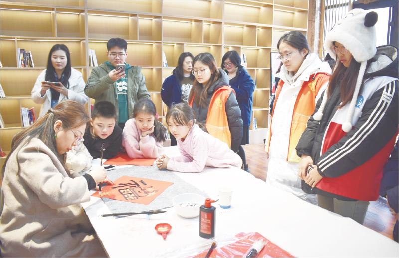“老师,麻烦写副带‘马’字的春联,给孩子图个吉利!”前排一名带孩子的妈妈说。书法老师欣然应允,手腕轻转,一副春联很快写就,还特意多写了一个“福”字。
