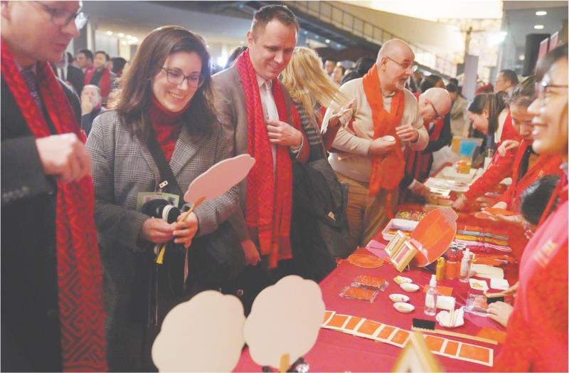 2月9日,在联合国总部举行的“骏启新程”新春庆祝活动上,嘉宾参观团扇展台。