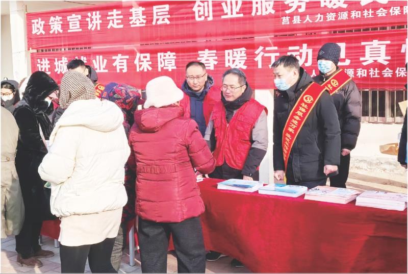 近日,莒县人力资源和社会保障局联合莒县邮政银行等金融机构于陵阳大集开展了“人社服务进万家”主题宣传活动,将社会保险、就业创业等服务送到群众家门口。