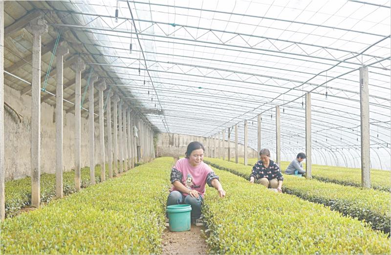 2月28日,在岚山区巨峰镇老龙窝村的茶叶大棚内,翠绿的茶树生机盎然,清香四溢。茶农们穿梭于茶丛间,熟练采摘嫩芽。