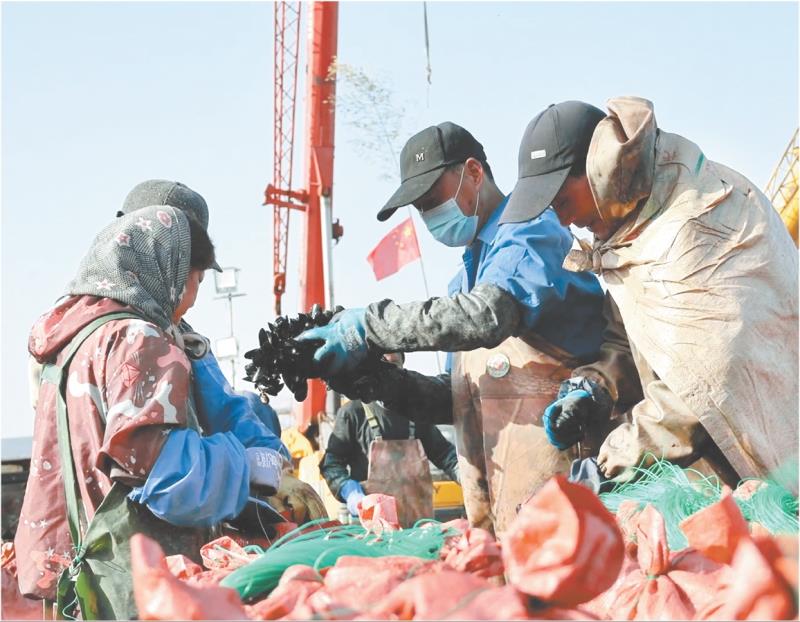 2月25日,岚山区中心渔港人来车往,伴随着吊车的轰鸣,一串串海虹被打捞上岸,工人们忙着脱绳、冲洗、装袋、过秤、装车。
