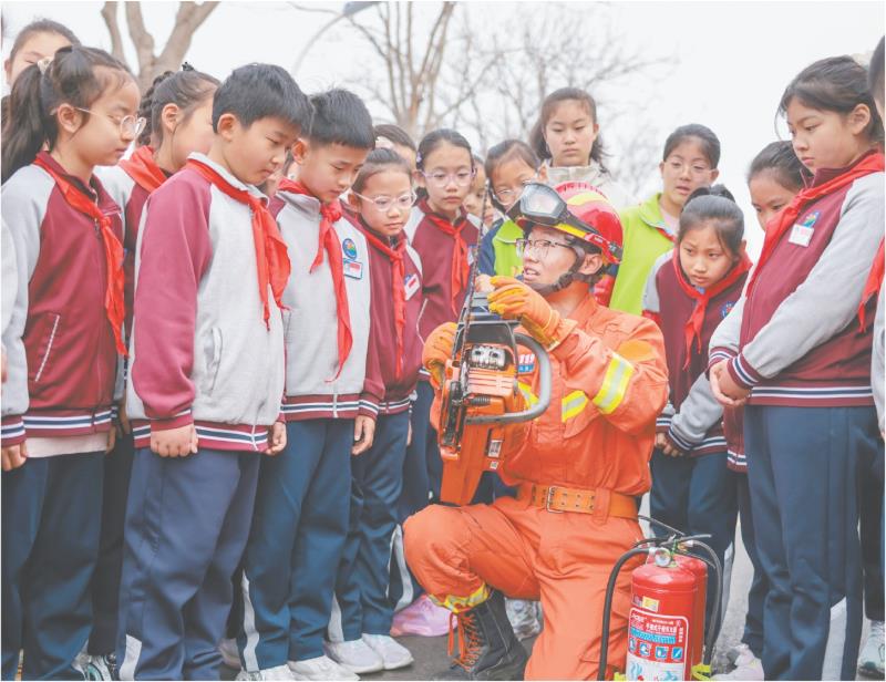 3月30日,在山东省荣成市府新小学,消防救援人员为学生展示消防破拆工具的使用方法。