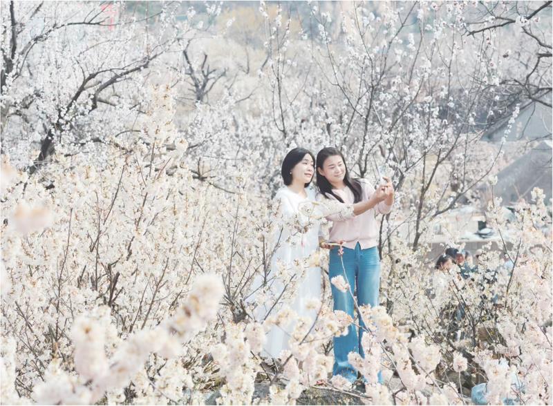 随着气温回升,樱桃花、杏花迎来盛花期,漫山粉白花朵缀满枝头,将村落与山岭装点成浪漫的“花的海洋”,不少游客慕名而来,在花海间拍照打卡,定格春日美好。