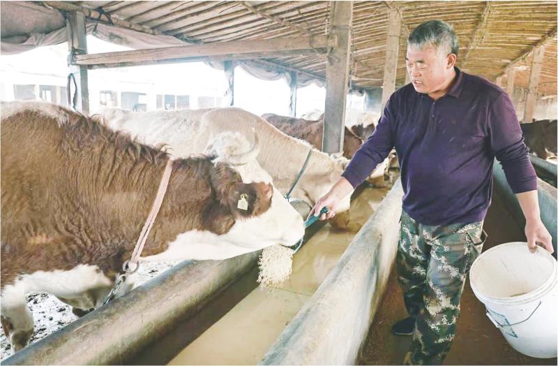 3月29日,在莒县果庄镇后梭庄村的一家肉牛养殖场内,村民正忙着给牛喂养饲料。