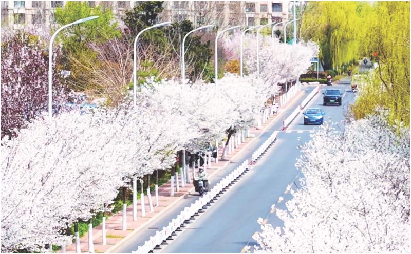 4月12日,东港区沙墩河西路,道路两侧花开正盛,宛若一幅流动的春日画卷。