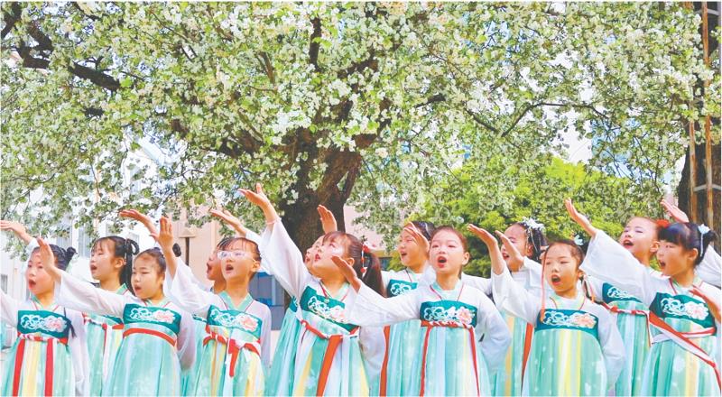 4月18日,孩子们在东港区政府大院的百年海棠树下表演节目。
