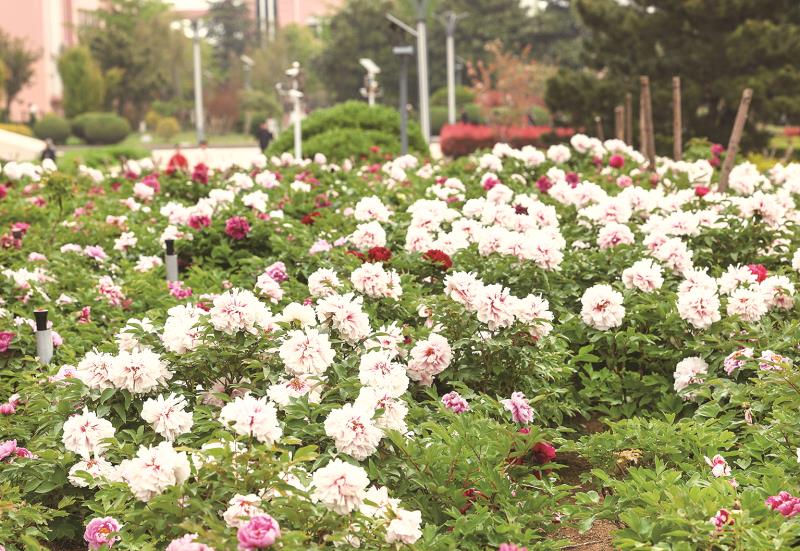 4月21日,山东水利职业学院校园内牡丹进入盛花期,层层叠叠的花朵与远处教学楼相映成趣,勾勒出一幅雅致的春日画卷。